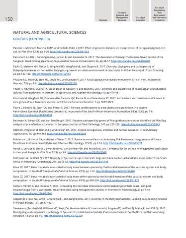 Slippers B B Crous PW Jami F Groenewald J J J and Wingfield MJ 2017 Diversity in in in in the Botryosphaeriales: Looking back looking forward In Fungal Biology 121 pp 307-321 Steenkamp (Bumby) MM Williams MC Steyl JCA Harrison-White R R Lutermann H H Fosgate GT de Waal PJ Mitha JR and Clift SJ 2017 Genotyping and comparative pathology of Spirocerca in in in in black-backed jackals (Canis mesomelas) in in in in South Africa In BMC Veterinary Research 13(245) pp 1-9 http://hdl handle net/2263/62220